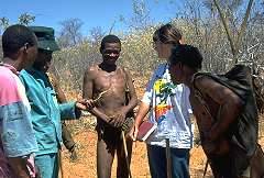 West Bushmanland has about 2000 inhabitants, mainly !kung. They belong to three different tribes - the Ju\oasi, Punguvlei and Vasekele. The ancestors of the Ju\oasi lived in the eastern part of Bushmanland as hunter-gatherers and even today, this region is mainly populated by them. The ancestors of the Punguvlei came from the Rundu area and those of the Vasekele from South Angola. Both groups lived as hunter-gatherers, but also practised to some extent shifting cultivation due to earlier contacts with Bantu tribes and the Portuguese. Both Punguvlei and Vasekele people came to Bushmanland during the time of the South African occupation, when they were employed by the South African Army and stationed in West Bushmanland. At that time, West Bushmanland was mostly unpopulated as there was no surface water. The South African Army drilled boreholes and so enabled people to settle permanently in West Bushmanland.
